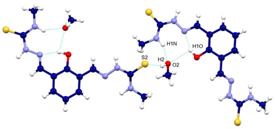 The ligand shows an E configuration with respect to the imine bonds and an anti conformation with both branches arranged on opposite sides. This arrangement is conditioned by the existence of intramolecular hydrogen bonds between the imine nitrogen and the hydroxyl group of the spacer. In addition, there are intramolecular hydrogen bonds between the phenolic hydrogen and the oxygen of the solvating molecule, as well as between the thioamide NH and the methanol oxygen atom, and between the OH group of the solvation molecule and the thioamide sulfur of an adjacent ligand. These interactions result in the ligand molecules being connected throughout the crystal lattice (Figure 4).