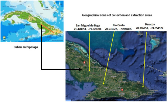 Adult individuals (males) were collected in the following sites of the eastern eco-geographical zone of the Cuban Archipelago (3: San Miguel de Baga-Guáimaro, GPS: 21.428853, −77.328784; Rio Cauto-Bayamo, GPS: 20.531927, −76.926885; Baracoa-Guantánamo, GPS: 20.316253. −74.554577) during the months of July–August of 2019 and 2020. The specimens (1 individual per geographic collection area) were kept in the Organic Chemistry Laboratory of the Faculty of Science & Technology at Technical University of Esmeraldas, Ecuador (vouchers 004–006). The geographical zones where the collection and secretion extraction were performed are depicted in Figure 1.