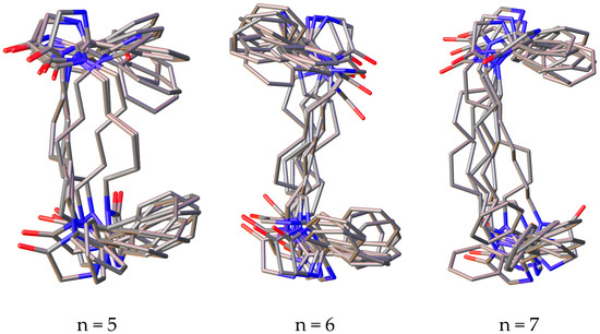 Superposition of the 10 most stable conformations of compounds 1a–f with the number of methylene units in the “spacer” from 2 to 7.