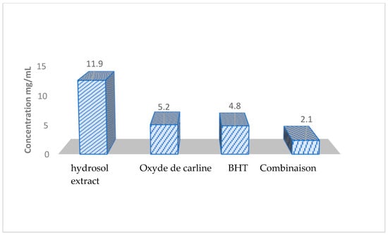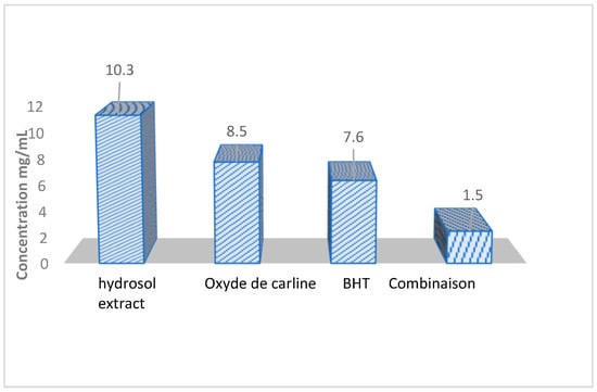 The combination of Carlina oxide and BHT exhibited the most robust activity in quenching the DPPH• radical, with an IC50 of 1.5 g/L. This IC50 is approximately five times lower than that of the synthetic antioxidant used as a reference, BHT (IC50 = 7.6 g/L; Figure 2). It was followed by BHT (IC50 = 7.6 g/L), Carlina oxide (IC50 = 8.5 g/L), and the hydrosol extract (IC50 = 10.3 g/L) (Figure 2).