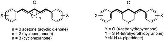 It is well established that compounds containing the 1,5-diaryl-3-oxo-1,4-pentadienyl pharmacophore have pronounced biological activity(ies) [1,2,3,4,5]. These cross-conjugated dienones are cytotoxic/antiproliferative to tumor cells, and they also exhibit anti-inflammatory, antimicrobial and antiparasitic activity [3]. They target the ubiquitin–proteasome system (UPS), which is known to be crucial for the viability of tumor cells, and are involved in the inhibition of deubiquitinases (DUBs). The Ar-CH=CH-CO-CH=CH-Ar moiety usually contains molecular scaffolds such as cycloalkanes, tetrahydropyrans, tetrahydrothiopyrans, piperidines, N-alkylpiperidines and N-acylpiperidines (Figure 1). One of the common features of the biologically active dienones is the presence of an electron-withdrawing substituent in the benzene ring, especially in the ortho-position. In the literature, these dienones are referred to as C5-curcuminoids [6] or monocarbonyl analogs of curcumin (MACs), and they have been extensively studied from different angles [7,8,9,10,11,12,13].