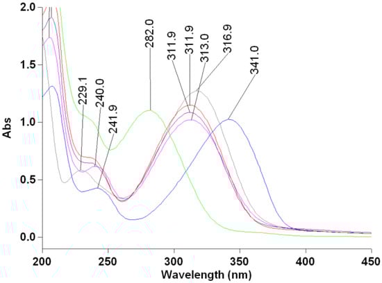 Based on our experience, cysteamine is usually not ideal for assays investigating the electrophilicity of MACs because it has a reactive nucleophilic primary amine that can react in a 1,2-fashion with the ketone to give 1,4-thiazepines [25]. Since MACs have two electrophilic sites, this intermediate can affect the addition of the second equivalent of thiol. We decided to eliminate the addition of the EDTA (for the prevention of the oxidation of thiol) and focus on short assays of 3 h with a freshly prepared solution of 2DMAESH. This turned out not to affect the results, and one can use relatively concentrated solutions (2.5 mg/mL, 0.0174 M), i.e., a 400-fold excess compared to the concentration of MACs, and have a spectral window ranging from 290 nm to 800 nm. Unfortunately, we were not able to carry out this thiol assay with (2E,7E)-2,7-bis(2-bromobenzylidene)cycloheptanone 2BrCH(ep), because its LAB was at 282 nm (Figure 3, Figure S2a and Figure S1b).