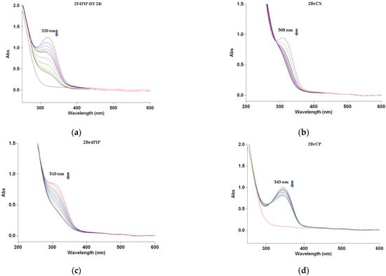 All analogs showed an intense long-wavelength absorption band (LAB) (λmax from 282 nm for 2BrCH to 341 nm for the cyclopentanone derivative, 2BrCP) and one more band at shorter wavelengths (Figure 3 and Figure S1). The LABs can be assigned to n − π*-type transitions, while the shorter-wavelength bands correspond to π − π*-type transitions (λmax from 235 nm to 242 nm). The key data are provided in Table 1, and the UV-Vis spectra of all pertinent analogs are depicted in Figure 3.