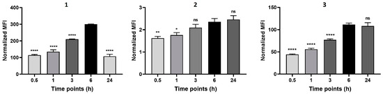 Cellular uptake of the BODIPY derivatives 1, 2, and 3 in 4T1 cells. Cell uptake was monitored by flow cytometry after 0.5, 1, 3, 6, and 24 h of incubation with 2.5 μM of each compound. Data are presented as mean ± SEM (n = 2). Statistical differences versus 6 h incubation: * p < 0.05, ** p < 0.01, **** p < 0.0001.