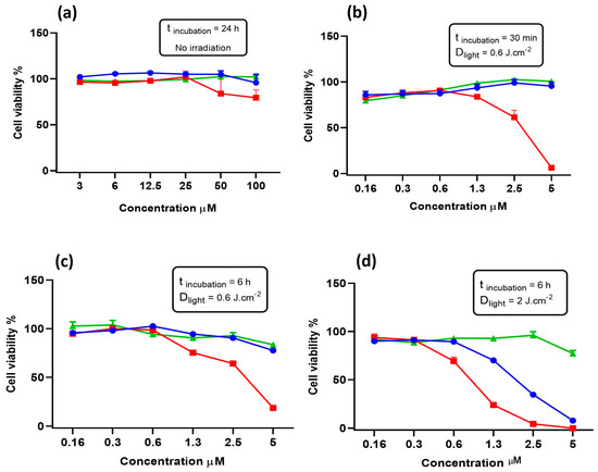 Cell viability of 4T1 cells incubated with BODIPY derivatives 1 (blue), 2 (green), and 3 (red) for 24 h without irradiation (a); for 30 min and irradiated with 0.6 J·cm−2 (b); for 6 h and irradiated with 0.6 J·cm−2 (c); and for 6 h and irradiated with 2 J·cm−2 (d).