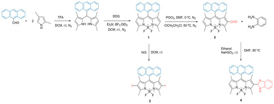 Scheme 1 shows the synthetic route to obtain the derivatives bearing an anthracene group at meso position and different functionalization at position 2 and/or 6 of the BODIPY core. The syntheses of BODIPY derivatives 1, 3, and 4 have been recently reported by our research group [13]. We employed the well-known Lindsey’s method (BODIPY precursor 1), followed by the halogenation reaction using N-iodosuccinimide (NIS) to obtain the BODIPY derivative 2, functionalized with iodine at positions 2 and 6.