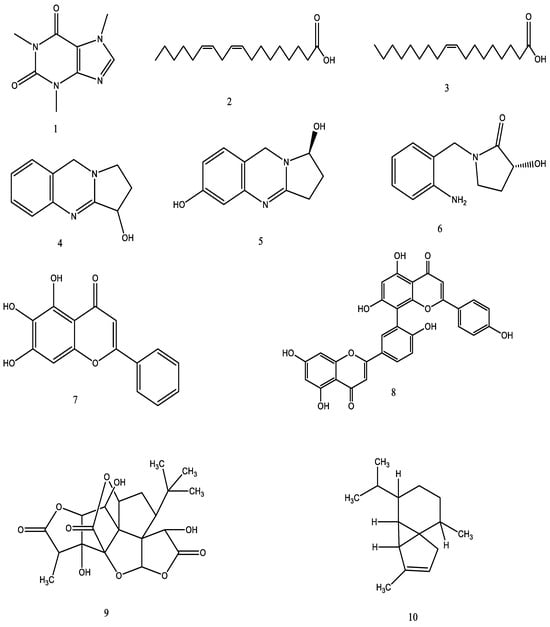 From the literature, ten phytoconstituents were selected for their neuroprotective action (Table 1) are caffeine (1), lenoleic acid (2), oleic acid (3), vasicine (4), vasicinol (5), vasicol (6), baicalein (7), amentoflavone (8), ginkgolide-B (9) and alpha cubebene (10) (Figure 1).