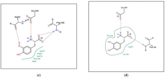 Binding configuration of levodopa with 3UZA (a) high dock, (b) low dock, (c) high match, (d) low match.