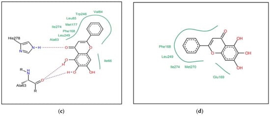 Binding configuration of Baicalein with 3UZA (a) high dock, (b) low dock, (c) high match, (d) low match.