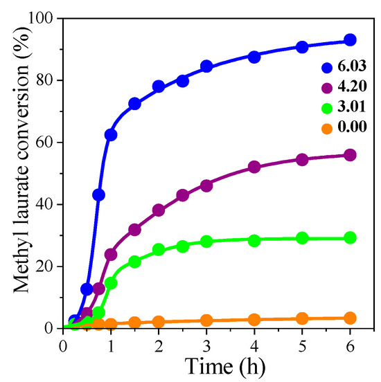 Other experiments were performed at 323 K using NaBH4/Al2O3-MS as the reducing agent, and the methanol/NaBH4 molar ratio varied between 0.0 (experiments without methanol) and 6.0. While there was no decrease in FAME when the experiments were carried out without methanol, the conversion of ML increased with the increase in the methanol/NaBH4 ratio in the experiments with methanol. Assuming that the selectivity of FOL is 100% in all experiments, the final LA yield reaches a maximum (YLA = 93%) when the methanol/NaBH4 molar ratio is 6.0. When a lower molar ratio is used, not only will the final LA results be lower, but the FAME conversion rate will also be slower; this can be determined by observing the slope of the change history versus time curve in Figure 3. In fact, when using the stoichiometric molar ratio of methanol/NaBH4, the final YLA value is only 29%, while when the methanol/NaBH4 molar ratio is 4.2, the final YLA value can be increased to 54%. These results show that the presence of methanol is very important and must be in excess for the reduction of FAME to FOL (methanol/NaBH4 molar ratio = 6.0). The need for more methanol can be explained by the fact that, in addition to the interaction with FAME during reduction, methanol also participates in other reactions in which methanol decomposes to form H2 in the presence of NaBH4. In the methanol decomposition of NaBH4, methanol is converted to H2 and NaBH4 is converted to Na[B(OCH3)4.