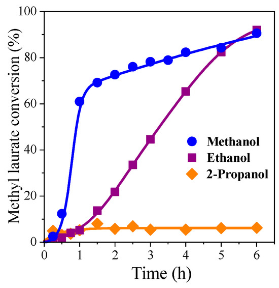 Experiments were carried out at 323 K using NaBH4/Al2O3-MS as the reducing agent and ethanol/NaBH4 and ML/NaBH4 molar ratios of 6.0 and 0.36, respectively. The results are shown in Figure 4. ML changes at the end of the 6 h study were similar to the decrease obtained with methanol and ethanol (Figure 4), with XML values increasing from 91% to 93%. However, in experiments with ethanol, ML conversion was slower; this can be calculated from the first slope test of the ML transformation compared to the reaction time curve in Figure 4. On the other hand, ML was not converted when 2-propanol was used as the H+ donor (XML = 6.2%). The length and complexity of reducing species difficult, due to the steric hindrance introduced, the interaction with NaBH4. In fact, the ethoxide and isopropoxide anions are larger than the methoxide anion. Therefore, problems arise in the incorporation into the borohydride structure and the simultaneous removal of the H-anion. When ethanol and 2-propanol are used, LA selectivity is lower and ethyl laurate and isopropyl laurate are produced. The selectivity of FOL is 100% when methanol is used. In summary, ML can be modified by reduction reaction to obtain the desired FOL and LA, especially when methanol is used as a short carbon chain alcohol, and the final LA yield reaches 93%. As the length and complexity of the alcohol carbon chain increase, the final FOL yield becomes lower because the steric hindrance introduced by the alcohol cannot support the occurrence of reduction. In fact, final LA yield results of 28.2% and 5.1% were obtained using only ethanol and 2-propanol, respectively.