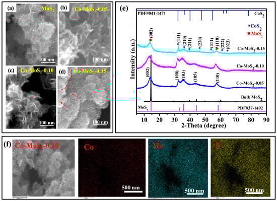 (a–d) SEM images, (e) XRD patterns of the MoS2 and Co-doped MoS2 samples, and (f) elemental mapping images of Co-MoS2-0.10; scale bar: 500 nm.