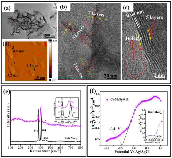 Co-MoS2-0.10. (a) TEM image, (b,c) front view and side view of HRTEM images, (d) AFM image, (e) Raman spectra, and (f) Mott–Schottky plot (inset: Mott–Schottky plot of bare MoS2).