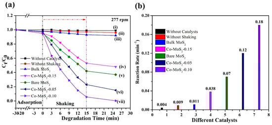 According to the catalytic degradation experiments, there were no obvious changes in the absence of a catalyst, showing that the self-degradation of tetracycline was negligible, as shown in Figure 3a. Firstly, under ultrasonic vibrations in the dark, Co-MoS2-0.10 showed 98.23% piezocatalytic degradation efficiency, while Co-MoS2-0.05 and Co-MoS2-0.15 attained 75.28% and 55.28% piezocatalytic degradation efficiency in 15 min (Figure 3a). As a result, suitable Co-doping amounts (Co-0.10 mole) provided the best performance. The pseudo-first-order kinetic characteristics of the piezoelectric catalytic process are illustrated in Figure 3b. Furthermore, the rate constants of only the shaking process (k = 0.004 min−1) and only the catalysts (k = 0.009 min−1) were lower than that of the bulk MoS2/shaking (k = 0.011 min−1), Co-MoS2-0.15/shaking (0.038 min−1), bare MoS2/shaking (0.07 min−1), Co-MoS2-0.05/shaking (0.12 min−1), Co-MoS2-0.10/shaking (0.18 min−1). The pseudo-first-order rate constant of the Co-MoS2-0.10/shaking system was 0.18 min−1, 16.36 times, 4.74 times, 2.57 times, and 1.5 times higher than the value of bulk MoS2/shaking, Co-MoS2-0.15/shaking, MoS2/shaking, and Co-MoS2-0.05/shaking systems. In addition, removal efficiencies of up to 91.81% for COD and 82.11% for TOC were achieved in the Co-MoS2-0.10/shaking system. As already mentioned, the bare MoS2 and Co-doped MoS2 samples exhibited the same odd-numbered layer. As a result, a suitable Co-doping amount (Co-0.10 mole) provided the best performance, indicating that the increased catalytic active sites of MoS2 generated piezoelectric current to promote the participation of piezopolarization in the catalytic performance. In addition, a suitable dopant amount tends to increase electron–hole separation, resulting in the highest catalytic activity. Obviously, increased cobalt loading in MoS2 leads to detrimental results. A large number of CoS2 nanoparticles aggregated each other and tended to form the morphology of crumbled bulk balls on the surface of MoS2 (shown in Figure 1d), which reduced the catalytically active sites of MoS2. Therefore, Co-MoS2-0.15 showed the lowest catalytic activity compared with that of Co-MoS2-0.05 and Co-MoS2-0.10. Increased cobalt loading in MoS2 leads to detrimental results.
