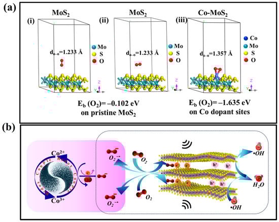 The activation of molecular oxygen to generate ROS such as hydroxyl radicals (•OH), superoxide radicals (•O2−), singlet oxygen (1O2), and hydrogen peroxide (H2O2) is an effective method for resistant organic pollutant breakdown and sterilization. Although it is a feasible strategy, its spin-forbidden nature hinders its activation and applications []. Recently, piezocatalytic molecular oxygen activation has been proposed. In this process, electrons and holes migrate toward the two sides of the catalyst surface and accumulate on the active sites due to a piezoelectric field induced by vibration energy, and then, the piezocharges react with molecular oxygen from dissolved oxygen or water to produce ROS []. Two-dimensional MoS2 piezoelectric catalysts have emerged as novel participants in the piezoelectric catalytic molecular oxygen activation reaction. Due to their non-centrosymmetric structure, single- and odd-numbered layers of MoS2 exhibit a high piezoelectric effect and can provide spatially distinct orientations of spontaneous polarization, as initially reported in 2014 []. However, molecular oxygen does not conduct through MoS2 because of its high band gap, poor inter-domain electron transport, and restricted catalytic active sites on the basal plane []. Foreign-element doping has proven to be a successful method of controlling the electronic structure of semiconductors, leading to higher catalytic activity in MoS2 as a result of the lattice distortion of atomic configurations []. Herein, because of a finite piezoelectric response during the piezocatalysis process, Co doping into odd layers of the MoS2 structure produced an additional catalytic active center in the Mo-S network and allowed for higher conductivity, which, in turn, enabled increased molecular oxygen adsorption energy and accelerated charge transfer. Moreover, a molecular oxygen activation mechanism is also proposed using DFT calculation and ROS detection experiments, and then, ultrafast piezoelectric catalytic antibiotic pollutant degradation activities are investigated as well.