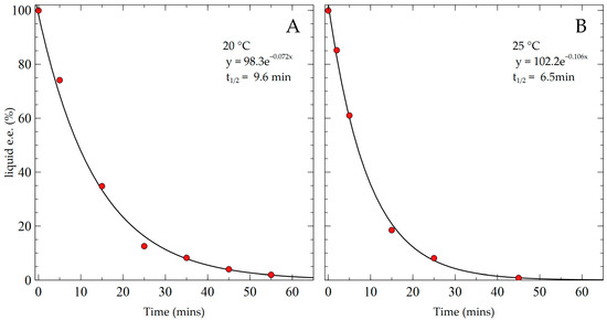Racemization rates of Cl-TAK with Amberlyst A26 in 60 wt% methanol-water solution at 20 °C (A) and 25 °C (B).