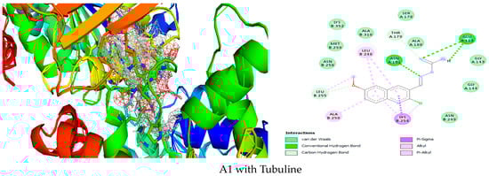 As we can see A1 is inside Tubulin (Figure 1), with good affinity due to Van der Waals interactions with ASN B:258, MET B:259, LYS B:352, ALA B:316, SER A:178, ALA A:180, GLY A:143, GLY A:144, ASN B:249, hydrogen bond GLU A:183, ASN A:101, carbon hydrogen bond THR A:179, Pi-Sigma LYS B:254,Pi- alkyl, alkyl ALA B:250, LEU B:248.