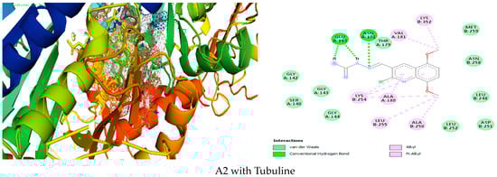 As we can see in (Figure 2), A2 is inside Tubulin with good affinity due to Van der Waals interactions with THR A:179, MET B:259, ASN B:258, LEU B:248, ASP B:251, LEU B:252, GLY A:144, SER A:140, GLY A:143, GLY A:142, hydrogen bond GLU A:183, ASN A:101, Alkyl and Pi Alkyl VAL A:181, LYS B:352, ALA B:250, LEU B:255, ALA A:180, LYS B:254.