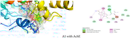 A1 is inside AchE (Figure 3), with good affinity due to Van der Waals interactions with ASP A:74, HIS A:447, GLY A:121, SER A:203, PHE A:297, PHE A:295, SER A:293, hydrogen bond TYR A:124, Pi-Pi stacked tyr A:341, trp A:286, VAL A:294, PHE A:338, TYR A:72.