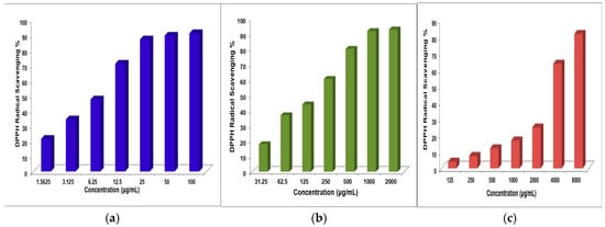 (a) DPPH radical scavenging activities of various concentrations of BHA standard; (b) DPPH radical scavenging activities of various concentrations of A1; (c) DPPH radical scavenging activities of various concentrations of A2.