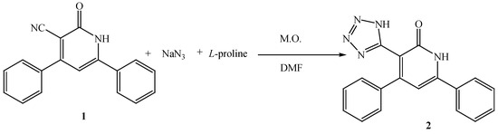 The [2 + 3] cycloaddition reaction was implemented between the nitrile group of the 3-cyano-2-pyridone 1 derivative and sodium azide in the presence of 30 mole % of L-proline to produce 1H-tetrazole 2-pyridones 2 (Scheme 2) which was isolated with a good yield. In the absence of the catalyst, no reaction took place.