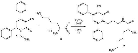 3.4. Preparation of 2,6-Diamino-N-(3-(3-cyano-2-oxo-4,6-diphenylpyridin-1(2H)-yl)propyl)hexanamide (9)