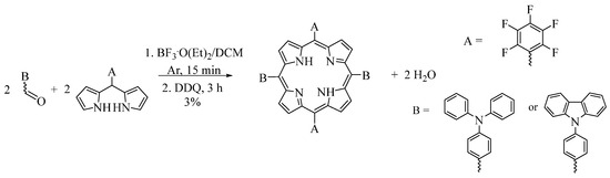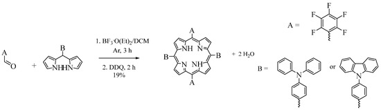 Therefore, due to these disadvantages, the reagents were exchanged to 5-(diphenylaminophenyl)dipyrromethane or di(4-(9-carbazolyl))dipyrromethane and 5-pentafluorobenzaldehyde to obtain the desired porphyrins (Figure 3).