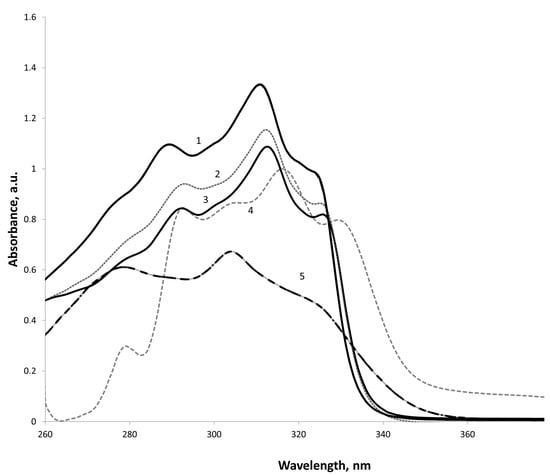 Figure 1. UV spectrum benzannelated analog 1a at concentrtation, 5 × 10−5 M in (1) propan-2-ol, (2) chloroform, (3) tetrachloromethane, (4) toluol, and (5) ethanol.