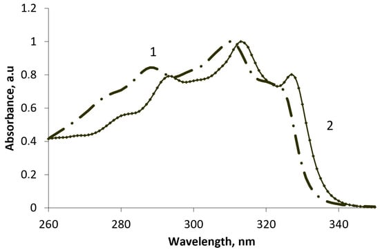 Figure 2. UV spectrum of the two tautomeric forms obtained by treating the source of the UV spectrum program MILCA for benzannelated analog 1a: (1) the ketonic form and (2) the enolic form.