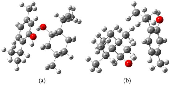 The formation of the Thym_Ment_1 dimer results in significant changes in the internal coordinates within the thymol and menthol monomers, contributing to the complex’s overall stability. A slight elongation of the O1-H25 bond in thymol is observed due to the formation of a hydrogen bond with the menthol hydroxyl group. In contrast, the O26-H56 bond in menthol remained unchanged at 0.968 Å, suggesting that the interaction primarily affects the thymol monomer. The value of distance O1…O26 is 2.797 Å. This is typical for hydrogen bonds and further confirms the formation of a stabilizing interaction between thymol and menthol. The newly formed angle of O1-H25…O26 is 152.2°, which is close to the ideal angle for hydrogen bonding.