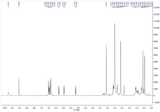 The position of the signals in the 1H NMR spectra of compound 6 in a mixture of chloroform and DMSO, along with the spin–spin interaction constants, is completely consistent with the presented structure (Figure 1). In the region of aliphatic protons, two singlets at 0.45 and 0.57 ppm correspond to the protons of the methyl groups at the nitrogen atom of the indole fragment of the molecule. The singlet signal at 2.09 ppm belongs to protons of two methyl groups at the ammonium nitrogen atom. The signal of O-CH3 was detected at 3.07 ppm. A doublet in the aromatic region at 5.17 ppm with a spin–spin interaction constant of 10.3 Hz corresponds to the CH group in the pyran moiety, which indicates the presence of a spirocyclic structure. The singlet signal at 9.04 ppm belongs to the proton of the formyl group.