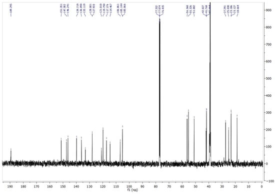 The signal at 105.06 ppm, which correlates in the 1H–13C HMBC spectrum with the signal of the protons of the methyl groups and the signals of the protons at the C3’ and C4’ carbon atoms, is characteristic and belongs to the spiro carbon atom (Figure 2). The signal at 189.29 ppm belongs to the proton of the formyl group.