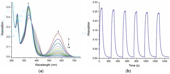 When a solution of spiropyran 6 in ethanol is exposed to UV radiation, a change in the absorption spectrum is observed (Figure 3a). In this case, a new absorption band appears in the visible range with a maximum in the visible region at 572 nm, indicating the formation of the merocyanine form. During the subsequent dark relaxation, a gradual decrease in the intensity of the photoinduced absorption band occurs, indicating the isomerization of the open form into the closed form.