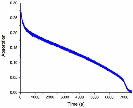 Degradation kinetics of compound 6 by UV under continuous irradiation through a light filter (UFS−1) registered at a wavelength of 572 nm.