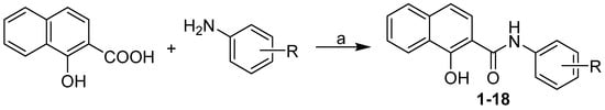 - Gonec, T.; Kos, J.; Zadrazilova, I.; Pesko, M.; Keltosova, S.; Tengler, J.; Bobal, P.; Kollar, P.; Cizek, A.; Kralova, K.; et al. Antimycobacterial and herbicidal activity of ring-substituted 1-hydroxynaphthalene-2-carboxanilides. Bioorg. Med. Chem. 2013, 21, 6531–6541. [Google Scholar] [PubMed]