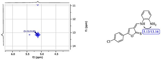 Using the example of 3-[((2-aminophenyl)amino)methylidene]-5-(4-chlorophenyl)furan-2(3H)-thione 3g, the NOESY 2D experiment showed the spatial proximity of the protons of the NH group and NH2 group, which corresponds to the cross-peak at 5.13/13.16 ppm, and also showed the absence of a correlation between the proton of the furan-2(3H)-thione and NH group, which additionally indicates in favor of the Z-isomer (Figure 1).