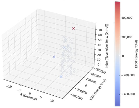 Chromones are a group of heterocyclic compounds, generally named as chromen-4-one. Various syntheses have incorporated halogen atoms into the phenyl ring of the chromone, which generates interesting interactions. Using the hydrogen and halogen bonding interactions (A°, °) and their energies (kJ/mol) a 3D scatter plot (Figure 1) was generated to visualize the relationship between the distances R (X axis), the total energy ETOT (Y axis), and the index of each point (Z axis, used as a placeholder in the absence of angle data). The color of the dots indicates the ETOT values, with warm colors representing higher energies and cool colors for lower energies. The generated 3D scatter plot allows to discuss the relationship between the geometrical parameters (bond distances and angles) and the interaction energies (especially the total energy, ETOT) in the hydrogen-halogen interactions observed in the compounds 1–29. As seen in the graph, as the distance R increases, the total energy ETOT tends to increase towards less negative values (closer to zero), indicating a decrease in the stability of intermolecular interactions. In this sense, stronger and more stabilizing interactions tend to occur at shorter distances, while weaker interactions, such as halogen-halogen interactions, occur at longer distances. Shorter interactions, with R values around 2.4–2.6 Å, show more negative ETOT energies (values between −17 and −30 kJ/mol), indicating that these interactions are significantly stabilizing. This suggests that the studied hydrogen and halogen bonds are well positioned geometrically in the crystal packing to optimize the stabilization of the supramolecular network in the crystal structures of the studied chromone heterocycles. Furthermore, as R exceeds 3 Å, ETOT values approach zero or even exhibit positive values, indicating that interactions at these distances are much weaker and less stabilizing. This can be attributed to halogen-halogen interactions, which are generally less energetically favorable compared to hydrogen bonds. Some extremely negative values (such as those found in compound 25, with ETOT = −129,216.2 kJ/mol) reflect outliers in the energy calculations that are not representative of typical intermolecular bond energies. Likewise, with respect to Variability in Total Energy Values (ETOT) the energies vary from approximately −30 kJ/mol to values close to 0 kJ/mol, suggesting a diversity of interaction types. Interactions with more negative values (e.g., −17.5 kJ/mol in Compound 1) tend to correlate with shorter distances, reinforcing the idea that shorter bonds are more energetically favorable. Regarding the effect of distances and angles on energy, it is observed that angles closer to 180° (as in the case of some hydrogen bonds with angles of 169°) tend to be associated with stronger interactions and more negative ETOT values. This type of linear geometry optimizes orbital overlap and strengthens the intermolecular interaction. In contrast, interactions with smaller angles tend to be weaker, as suggested by the case of some halogen-halogen interactions in the analyzed compounds.