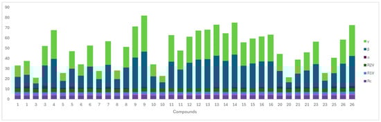 Figure 2 shows geometric parameters of π-π interactions kind staking of the 1, 3–16, 20–23, 25 and 26 compounds. The distances between the centroids of the chromone rings vary between approximately 3300 and 4100 Å. This indicates that the rings are not perfectly aligned and have considerable displacement, which is typical of π-π offset/slipped interactions. The shortest distances are present in compounds such as 3 and 5, while the longest distances are observed in compounds 9 and 10. This suggests that compounds with longer distances could have interactions π-π weaker. Likewise, the vertical displacements are close to the distances between the centroids, which indicates that the interaction π-π is not perfectly stacked, but rather displaced (slipped). The values of vertical distance from the ring centroid (R1V and R2V) indicate a parallel displacement pattern, typical of π-π interactions in many aromatic compounds. In some compounds such as 10 and 26, the vertical distance values show little variation (e.g., 3.445 and 3.474 Å), which could imply relatively good alignment, but with possible weaker interactions than in compounds with smaller distances. Moreover, compounds with larger angles and distances, such as compound 9, show weaker π-π interactions, which could affect the stability of structures in biological systems or materials. Likewise, small angles as in compound 3 (α = 1°, β = 4.5°, γ = 5.7°) suggest a near-perfect overlap of the rings, which favors an interaction π-π stabilizing.