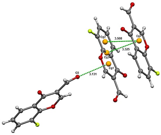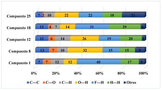 The relative contributions of the intermolecular contacts on the Hirshfeld surface for the set of compounds to which compound 8 belongs are shown in Figure 8. It is observed that they share a main contribution (15–40%) corresponding to the F ··· H interaction [11], due to the high proportion of terminal fluorine atoms in all the molecules, which suggests a clear preference of interaction between hydrogen atoms with fluorine atoms [12,13,14,15]. The second relative contribution (12–32%) is that generated by O ··· H contact, which associates the classical hydrogen bond C—O ··· H. It is inferred that the presence of the carbonyl group in compound 8 favors this type of intermolecular contacts due to the nature of the aldehyde group. The other contacts of minor contribution also help to stabilize the crystal lattice and correspond to weak C ··· F, O ··· O, O ··· F, F ··· F contacts.