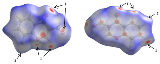 A random search of articles was performed using keywords such as “haloalkylchromones” and “chromones” to obtain a crystallographic codes of crystal structures featuring the heterocycle benzopyran chromone, which is composed of an aromatic ring fused to a 4-pyran ring. Subsequently, CIF files were downloaded from the Cambridge Crystallographic Data Center (CCDC). A total of 29 molecules were processed with the programs Mercury 2022.3.0, PLATON for Windows (v1.17.53 of WinGX) and Crystal Explorer 3.1, in order to elaborate molecular plots, calculate geometrical parameters and generate Hirshfeld surfaces, respectively. For hydrogen bonds, the following criteria were used: d(D—A) < R(D) + R(A) + 0.50 Å and d(H—A) < R(H) + R(A)—0.12 Å, with an angle D-H—A > 100.0°. D is the donor atom, A the acceptor, R the van der Waals radius and d the interatomic distance. In the representation of short contacts, those smaller than the sum of the Van der Waals radii + 0.3 Å were considered. Etter’s notation was used to describe hydrogen bond sets in organic crystals, where R represents the ring, r the number of atoms in the ring, a the acceptor atoms and d the donors. Hirshfeld surfaces include the descriptors dnorm (normalized contact distance), curvedness index and shape index, which provide information about the chemical behavior of the molecule. The dnorm surface highlights intermolecular interactions: red areas indicate short contacts, white areas common contacts, and blue areas long contacts. The 2D fingerprint plots depict de/di interactions in the range of 0.8 to 2.6 Å, including reciprocal contacts. The 3D dnorm surfaces are mapped over a fixed color scale of −0.243 au (red)—0.824 au (blue) Å, shape index in the color range of −1.0 au (concave) –1.0 au (convex) Å, and curvedness index in the range of 14–4.0 au (flat)—0.4 au (singular) Å. The surface properties above mentioned (dnorm, shape and curvedness index) were used to identify planar stacking. Intermolecular interaction energies were calculated using monomeric wave functions at the HF/3-21G level, obtaining accurate values of electrostatic, polarization, and repulsion energies for molecules separated by no more than 3.8 Å within the cluster.