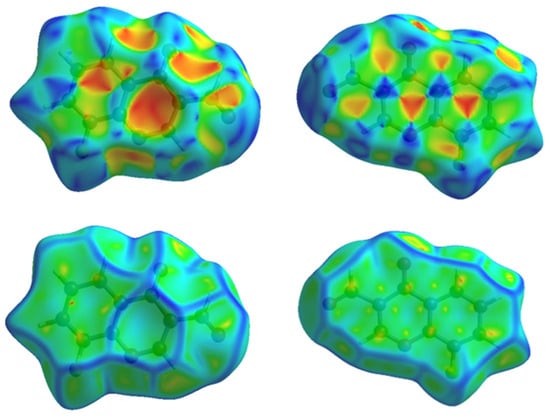 The shape index and curvedness properties are illustrated in Figure 6. These properties help to identify and visualize planar stacking arrangements. The alternating red and blue bowtie-shaped triangles observed on the surfaces generated with the shape index property are evidence of π···π stacking arrangements in the crystal lattice. The red colored triangles are concave regions associating ring atoms located above, giving rise to π···π stacking interactions, while the blue colored triangles are convex regions indicating aromatic ring atoms of the molecule within the surface. Similarly, the π···π interactions are evident as relatively broad flat regions of green color, bounded by blue contours of the surfaces resulting from the curvature index or curvedness.