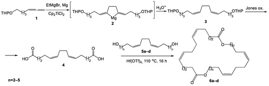 In the present work, the synthesis of new unsaturated macromolecules with several 1Z,5Z-diene fragments in the structure for subsequent study of their biological properties is realized. Taking into account the previous studies, a scheme for the preparation of new tetraene macrodiolides from 1,14-tetradeca-5Z,9Z-dienoic acid 4 and α,ω-alka-nZ, (n + 4)Z-dienediols 5a–d was developed, the synthesis of which is based on the use of the reaction of catalytic homo-cyclomagnesiation of 1,2-dienes (Dzhemilev reaction) [10,20]. The target macrodiolides were synthesized using Hf-catalyzed intermolecular cyclocondensation of dienic acid 4 with diols 5a–d in yields of 67–76% (Scheme 1) [10].
