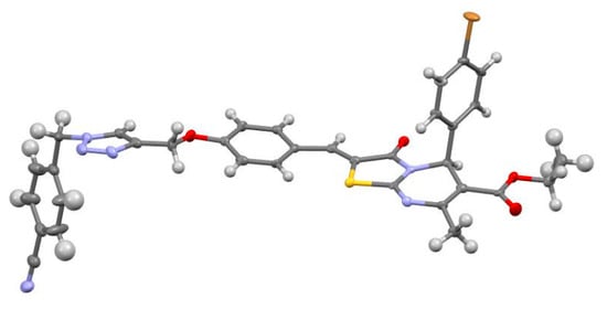 Next, the obtained 4-hydroxybenzylidenethiazolo[3,2-a]pyrimidine 3 was introduced into Mitsunobu reaction with propargyl alcohol to give propargyl ester 4. The final step was the click reaction between the propargyl derivative on the thiazolo[3,2-a]pyrimidine platform 4 and 4-(azidomethyl)benzonitrile 5. Thus, ethyl (Z)-7-methyl-3-oxo-5-(4-bromophenyl)-2-(4-((1-((1-(4-cyanobenzyl)-1H-1,2,3-triazol-4-yl)methoxy)benzylidene)-2,3-dihydro-5H-thiazolo[3,2-a]pyrimidine-6-carboxylate 6 was obtained in high yield (83%). The structure of the obtained compound was confirmed by a complex of physicochemical methods of analysis. Also, the structure of this compound was confirmed by X-ray diffraction analysis (see Figure 3).