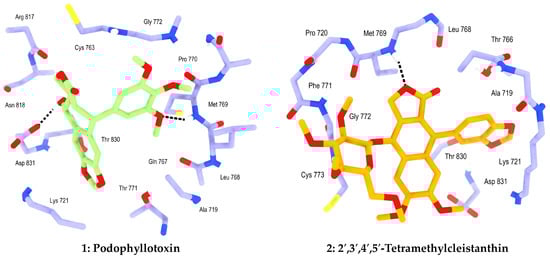 Podophyllotoxin formed two hydrogen bonds in the inhibition of tyrosine kinases. The first bond occurred between the hydroxyl (OH) group and Asp 831, while the second was between the methoxy oxygen and Met769.