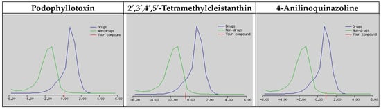 The drug-likeness score (DLS) helps to determine whether a chemical compound is a suitable candidate for medication. Compound 1, which exhibited the highest stability in the active site of the EGFR enzyme (docking score: −8.02), demonstrated a favorable drug-likeness score (DLS: 0.11), making it suitable for oral administration. In contrast, compound 2 showed a DLS score of −0.42 (Figure 2).