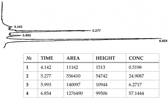 The reaction progress was monitored by analytical HPLC (Figure 1). The peak at 5.542 min belongs to the fullerene derivative, and the peak at 6.712 to unreacted free fullerene. Increasing the temperature and reaction time and changing the reagent ratio led to an increase in the intensity of the peaks at the fourth minute, which corresponds to polyaddition products.