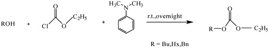 In order to test our idea and select the most optimal conditions, it was necessary to obtain the simplest organic carbonates. The latter were obtained by the interaction of alcohols with ethyl chloroformate in the presence of triethylamine in a ratio of 1:1:1 (r.t., 3 h). Unfortunately, this method did not lead to a pure target product. According to [6], replacing triethylamine with N,N-Dimethylaniline (1.5 mol) leads to the required carbonates, which have a pleasant floral–fruity aroma (Scheme 2).
