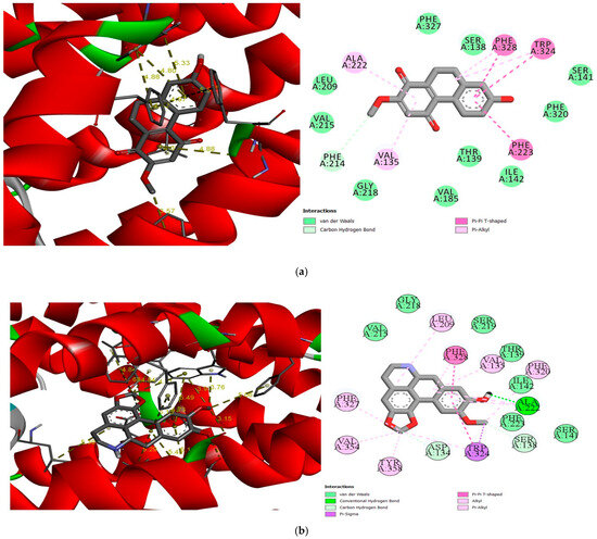 As for the hydrogen bond in the protein–ligand interaction, the donor and acceptor pairs should be at a distance of 2.7–3.3 Å. Ephemeranthoquinone (CID 10038025) and actinodaphnine (CID 160502) have different hydrogen bond distances in this investigation, as illustrated in Table 2.