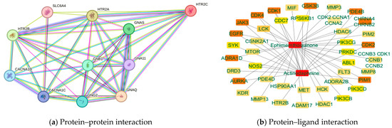 The network diagram data of the targeted protein with other proteins and the top two compounds with other protein interactions are shown in Figure 2a, whereas the interacted protein HTR2A is also responsible for SCZ. Conversely, Figure 2b shows that candidate compounds primarily influenced the genes PIM1, GSK3B, and EGFR.