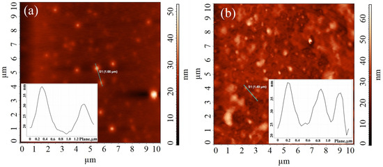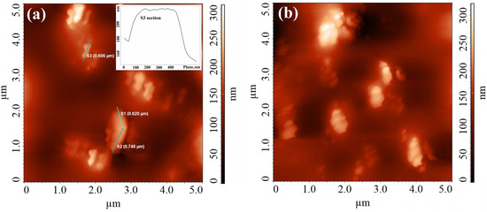AFM images for OTh-PDLLA films obtained from its dispersion in DMSO at c = 10 mg/mL deposited on glass (a) and PLA film (b).